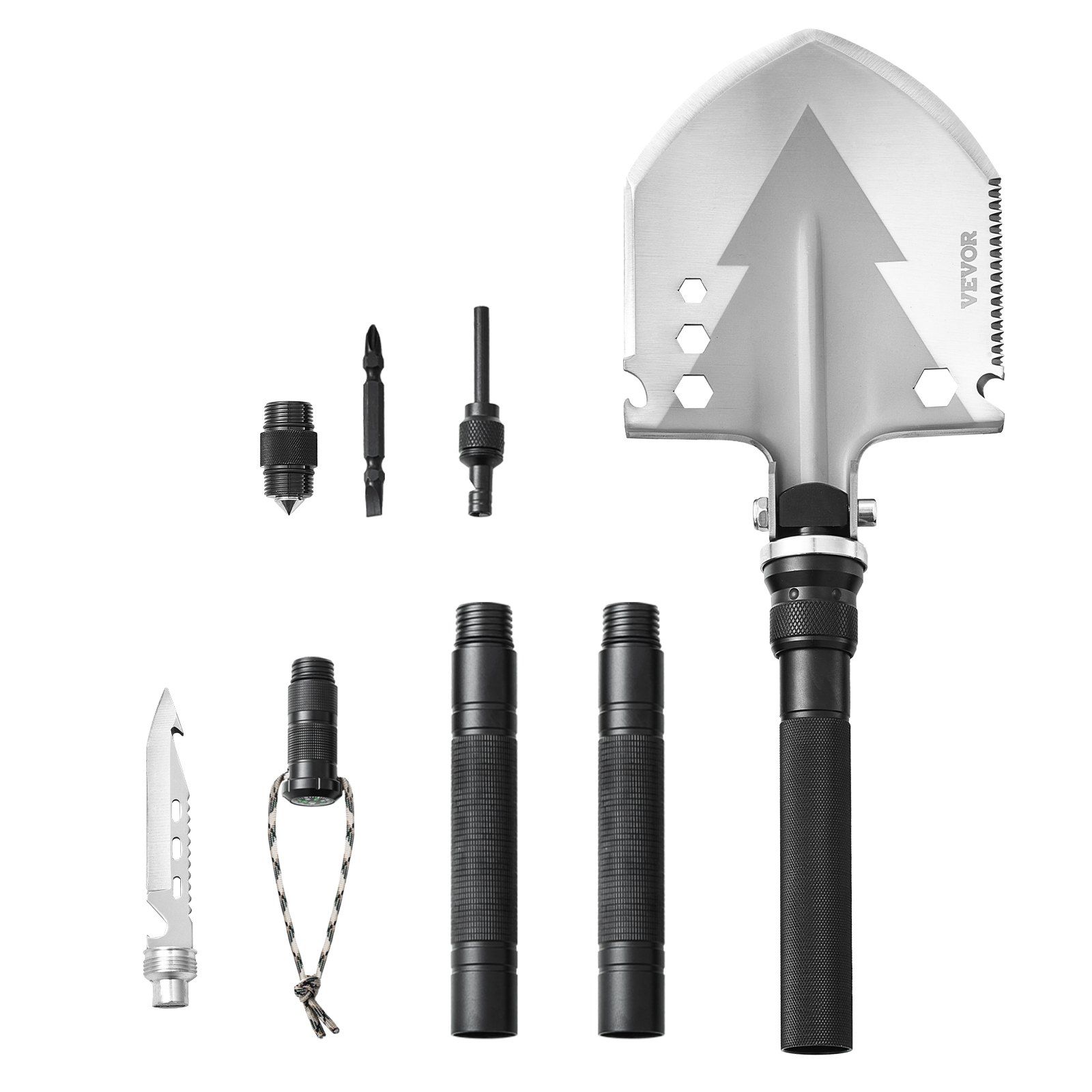 This survival shovel multitool includes a shovel, knife, compass, whistle, fire starter, glass breaker, and more—perfect for digging, chopping, cutting, signaling, fire-starting, self-rescue, and opening bottles. A true all-in-one tactical outdoor tool built for real-world use.